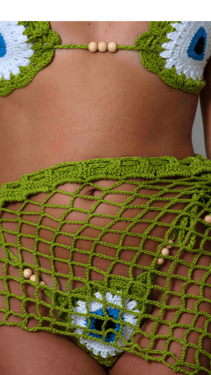 Jupe de plage en crochet artisanal, réalisée à la main en fil vert intense et lumineux, inspirée par l’énergie naturelle de l’été et l’esthétique bohème balnéaire. Sa coupe taille basse épouse délicatement les hanches, mettant en valeur la silhouette avec sensualité et modernité.